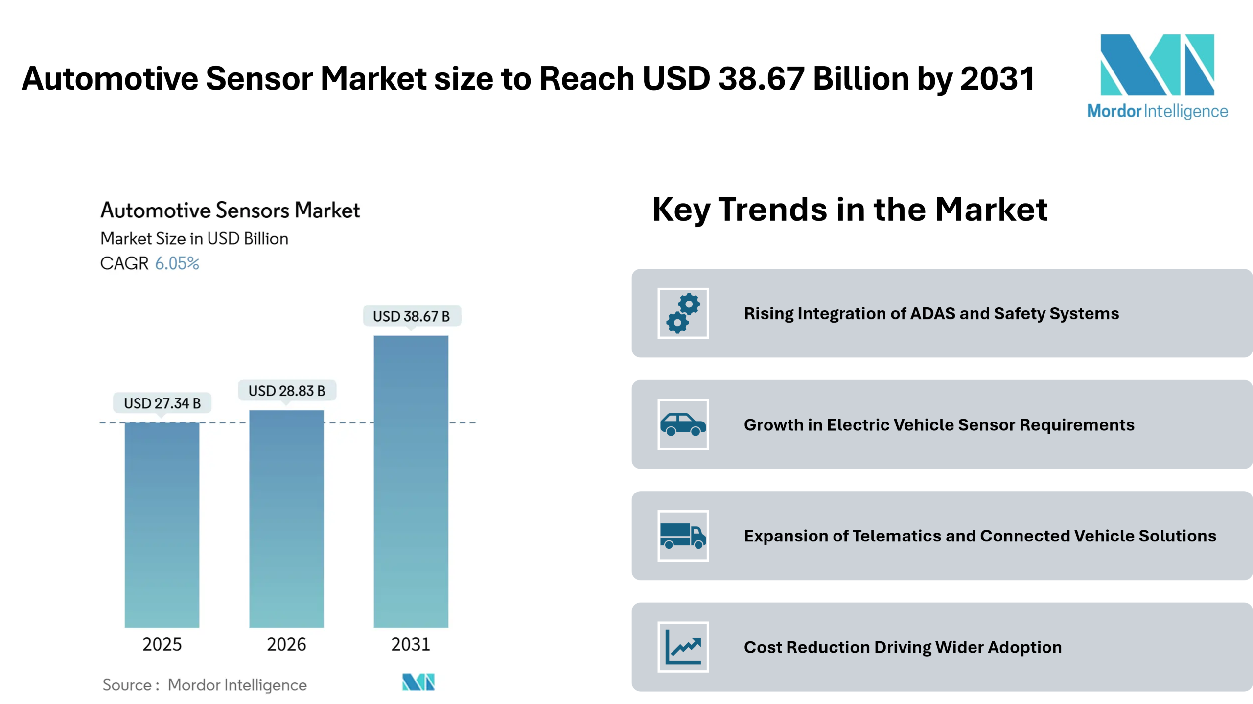 According to Mordor Intelligence, the automotive sensor market size was valued at USD 27.34 billion in 2025 and is estimated to grow to USD 28.83 billion in 2026, reaching USD 38.67 billion by 2031, registering a CAGR of 6.05% during the forecast period. This steady automotive sensor market growth reflects the increasing integration of sensors across modern vehicles, where safety, efficiency, and connectivity are becoming standard expectations rather than premium features.