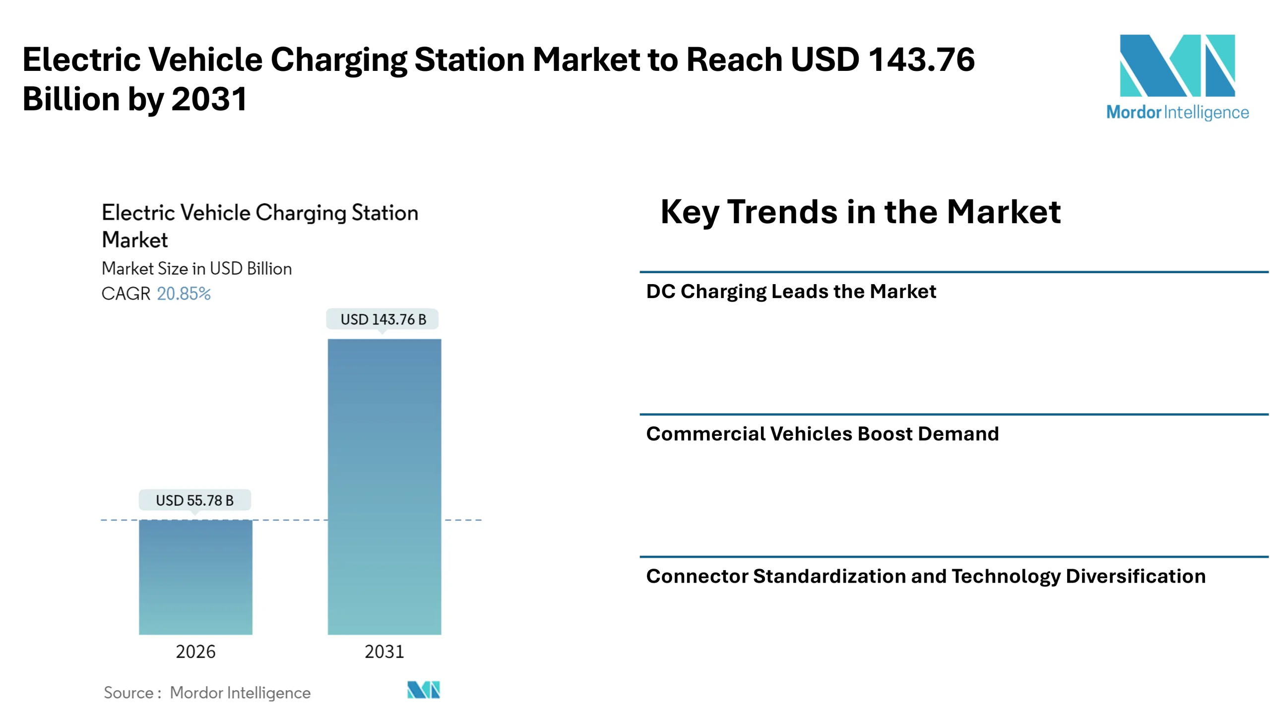 The global Electric Vehicle Charging Station market size is on a strong growth trajectory as the adoption of electric vehicles accelerates worldwide. According to Mordor Intelligence, the market was valued at approximately USD 55.78 billion in 2026 and is expected to expand to around USD 143.76 billion by 2031, growing at a robust CAGR during the forecast period. This expansion reflects growing demand for reliable charging infrastructure, advancing battery technologies, supportive government policies, and investments in both public and private charging networks.
