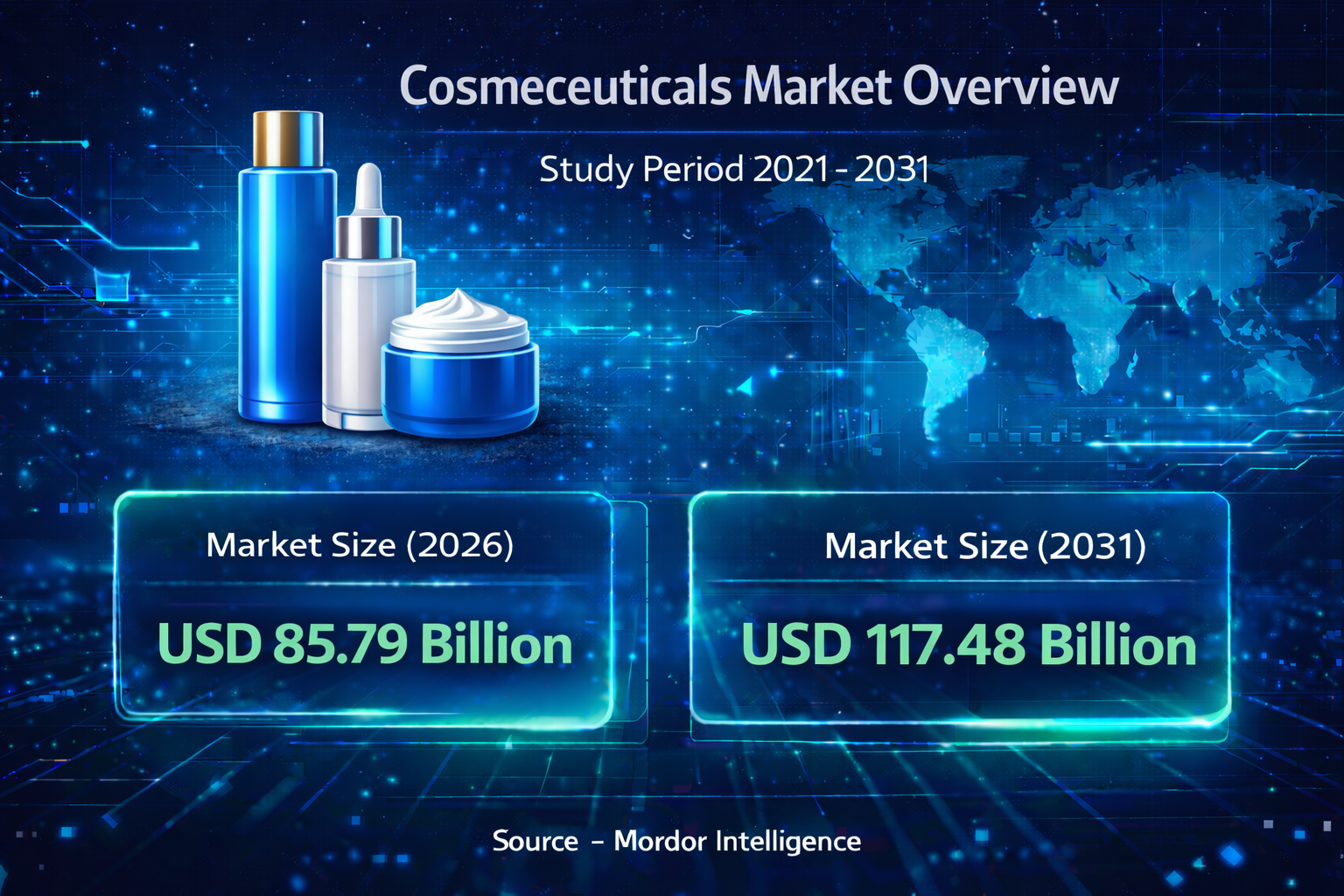 The global cosmeceuticals market size is projected to grow from USD 85.79 billion in 2026 to USD 117.48 billion by 2031, registering a CAGR of 6.49% during the forecast period. The expanding Cosmeceuticals Industry reflects rising consumer demand for clinically validated skincare solutions, increasing awareness of preventive dermatology, and growing adoption of premium sun protection and anti-aging formulations.