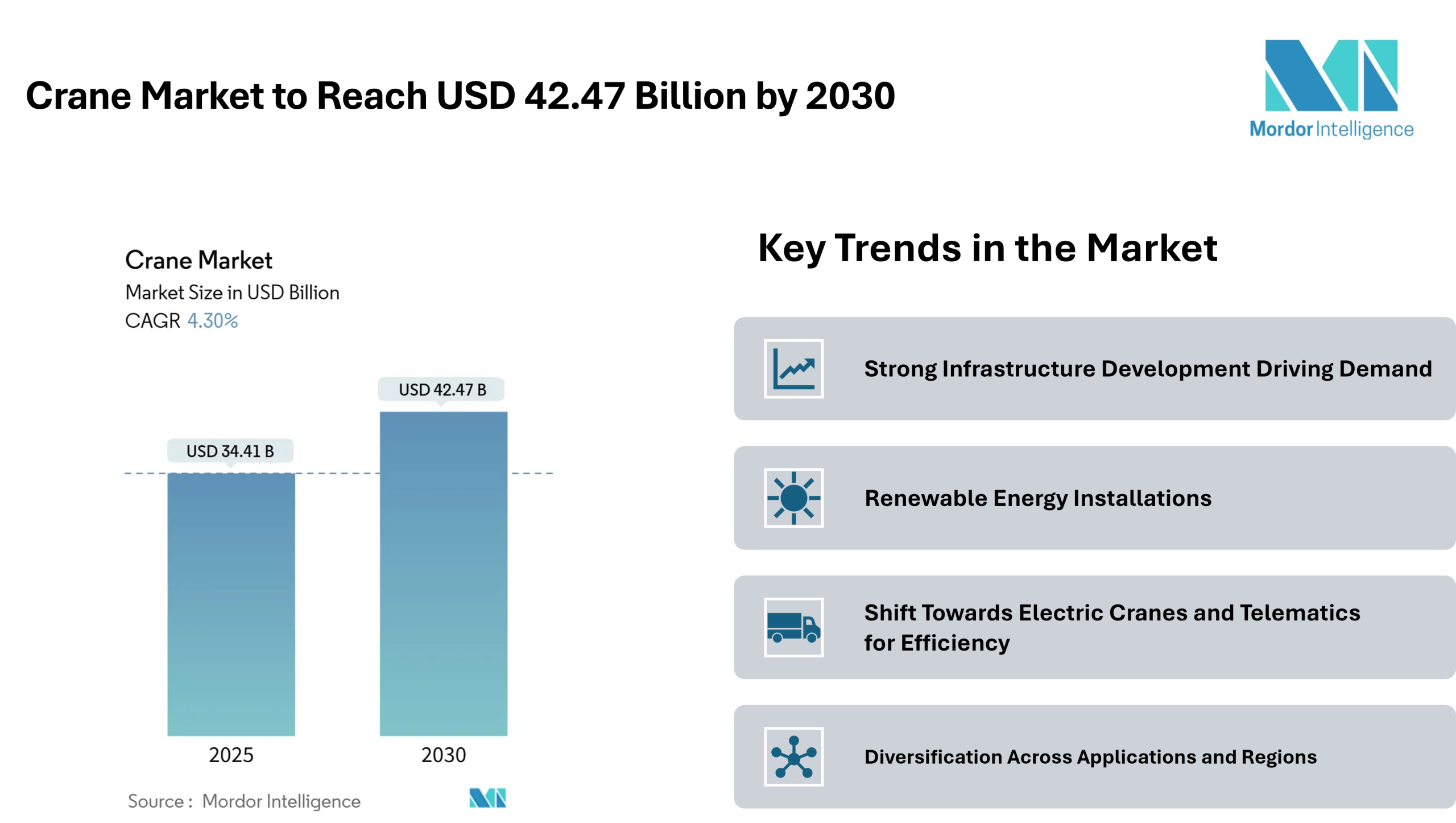 The crane market reached USD 34.41 billion in 2025 and is projected to advance to USD 42.47 billion by 2030, translating into a 4.30% CAGR. This growth is underpinned by a variety of factors, including increased public infrastructure spending, large-scale private megaprojects, and a growing emphasis on renewable energy installations. As the world navigates evolving construction needs and energy transitions, the demand for versatile, high capacity lifting equipment continues to rise.