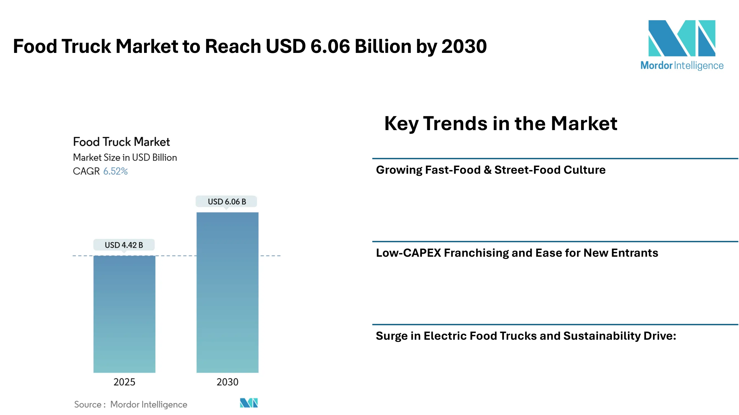 Low-CAPEX Franchising and Ease for New Entrants: Compared to opening a traditional brick-and-mortar restaurant, launching a food truck requires lower initial investment. This makes the food truck market accessible to entrepreneurs and small-business owners.