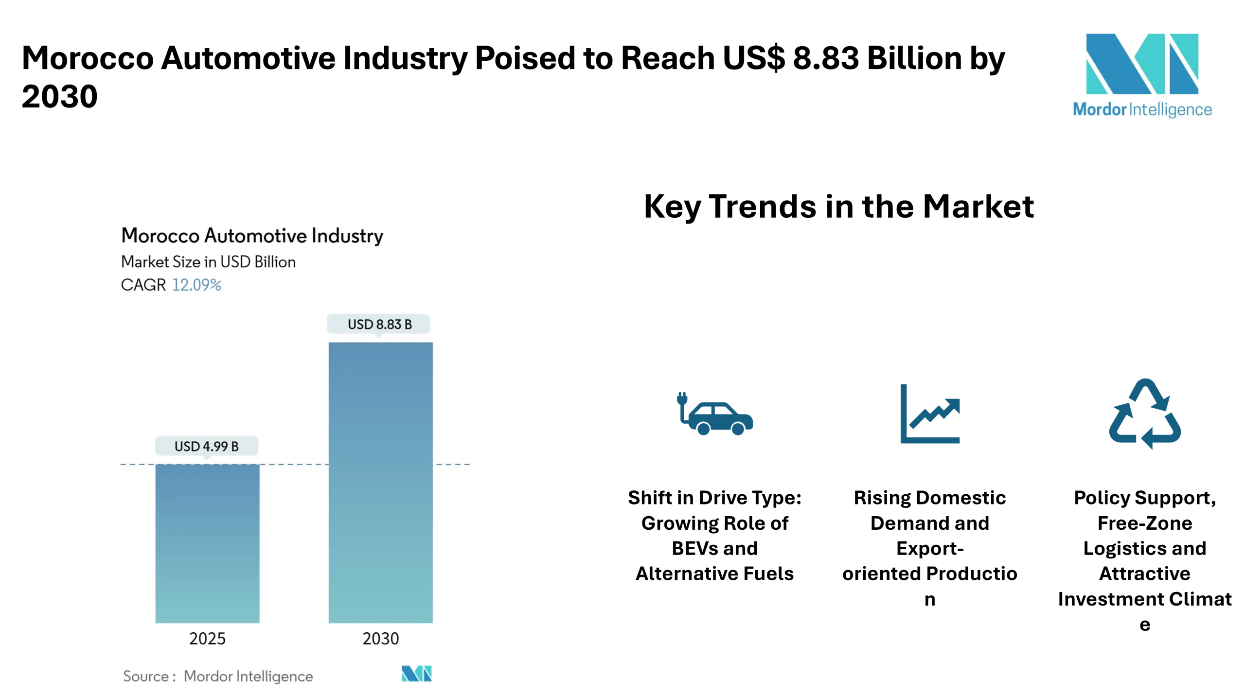The morocco automotive industry is entering a phase of robust expansion and transformation. From a base value of US$ 4.99 billion in 2025 to a projected US$ 8.83 billion by 2030, the growth is driven by strong passenger vehicle demand, increasing commercial-vehicle demand, rising interest in electric and alternative-fuel vehicles, and a supportive policy and manufacturing environment. The industry’s segmentation across vehicle types, drive systems, fuel types, end-uses, and regions shows balanced diversification. With an established base of OEMs, a growing supplier ecosystem, and the inflow of battery- and EV-related investment, the morocco automotive industry is well-positioned to serve both European export markets and meet future global automotive trends. As Morocco continues to build capacity and invest in infrastructure and skills, the automotive sector is likely to remain one of the most significant contributors to the country’s industrial output, export revenue, and economic growth.