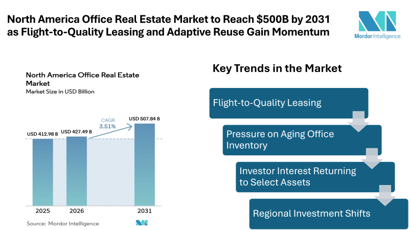 According to Mordor Intelligence, the North America office real estate market size is estimated at USD 427.49 billion in 2026, increasing from USD 412.98 billion in 2025, and projected to reach USD 507.84 billion by 2031, expanding at a CAGR of 3.51% during the forecast period. This outlook reflects both recovery and structural change within the industry, where companies are reassessing workspace strategies while property owners modernize portfolios.