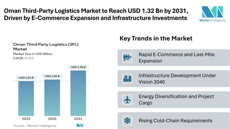 According to Mordor Intelligence, the Oman third-party logistics market is expected to grow from USD 1.01 billion in 2025 to USD 1.06 billion in 2026 and is forecast to reach USD 1.32 billion by 2031, registering a CAGR of 4.55% during the forecast period. This steady expansion reflects increasing trade activity, public infrastructure spending, and stronger demand for specialized logistics services across sectors. The industry is supported by ongoing investments in ports, airports, and road corridors under national development programs. Capacity additions at Sohar, Duqm, and Salalah have shortened lead times and improved multimodal connectivity.