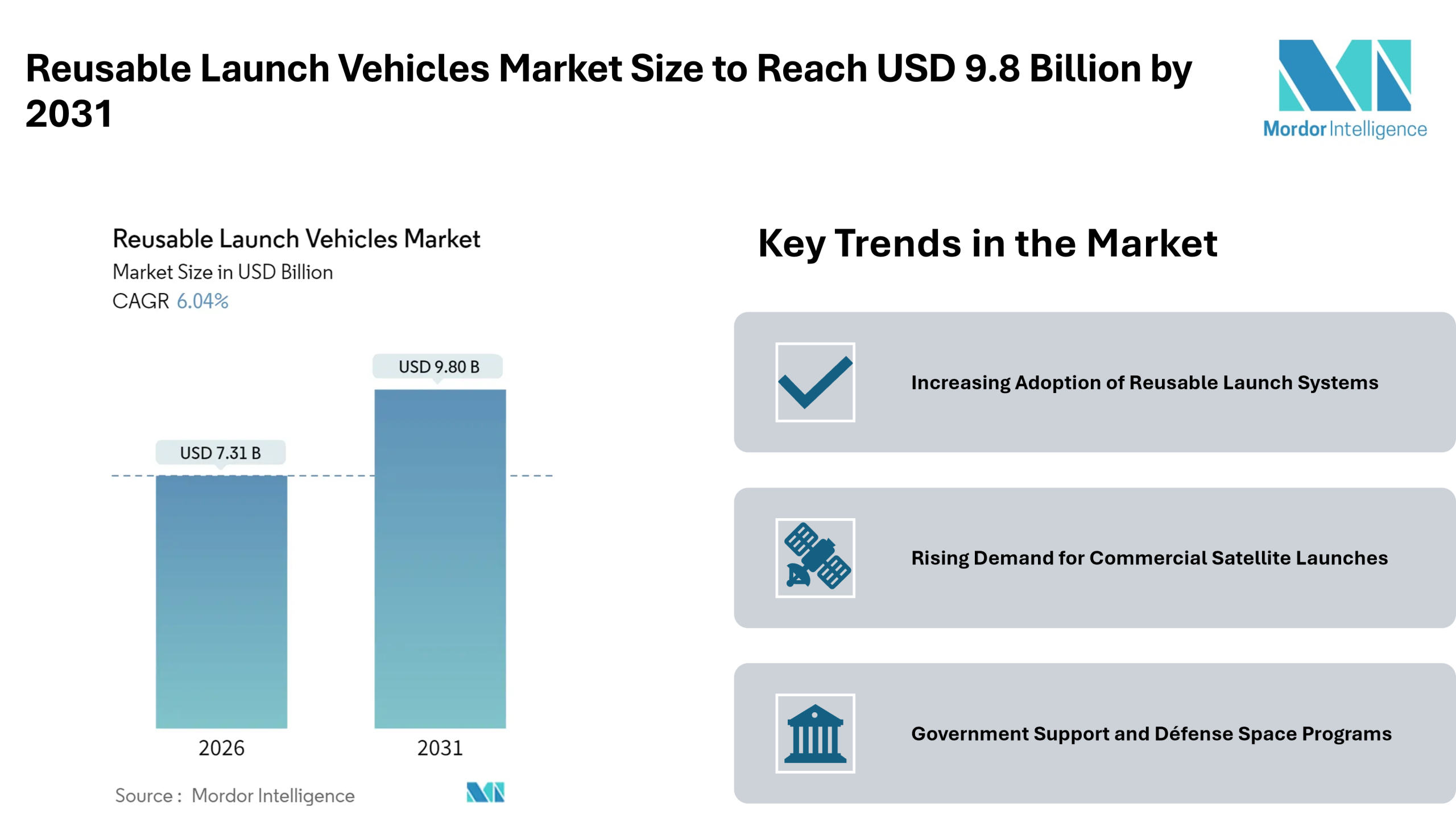 The Reusable Launch Vehicles market is witnessing steady growth as space agencies and commercial launch providers increasingly adopt reusable systems to reduce launch costs and improve mission efficiency. According to Mordor Intelligence, the market was valued at approximately USD 7.31 billion in 2026 and is projected to reach around USD 9.8 billion by 2031, growing at a CAGR of about 6.04% during the forecast period.