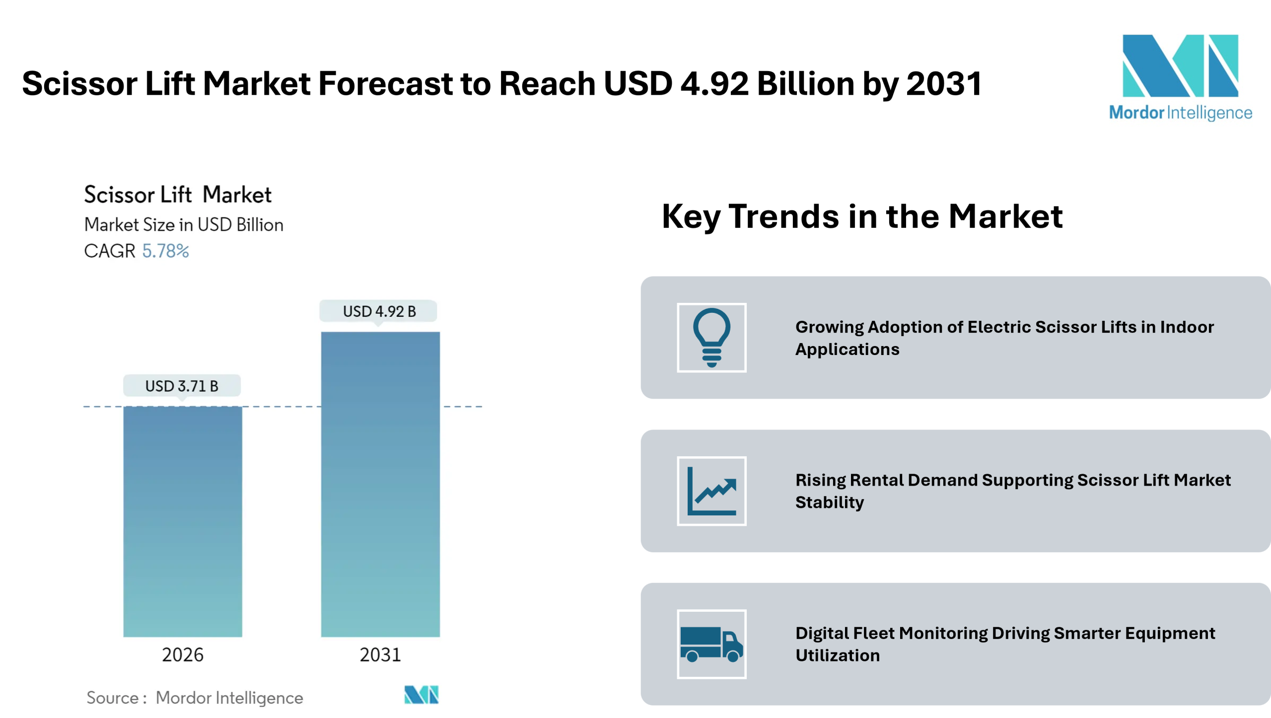 According to Mordor Intelligence, the scissor lift market size at USD 3.71 billion in 2026, and is projected to achieve USD 4.92 billion by 2031. This outlook reflects consistent scissor lift market growth supported by infrastructure development, warehouse expansion, and the growing preference for rental-based access equipment.