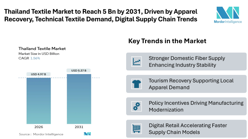 According to Mordor Intelligence, the thailand textile market size is expected to grow from USD 4.97 billion in 2026 to USD 5.37 billion by 2031, registering a CAGR of 1.56% during the forecast period. Growth is supported by domestic tourism recovery, BOI incentives for machinery upgrades, and expanding e-commerce, despite pressures from rising wages and low-cost imports.