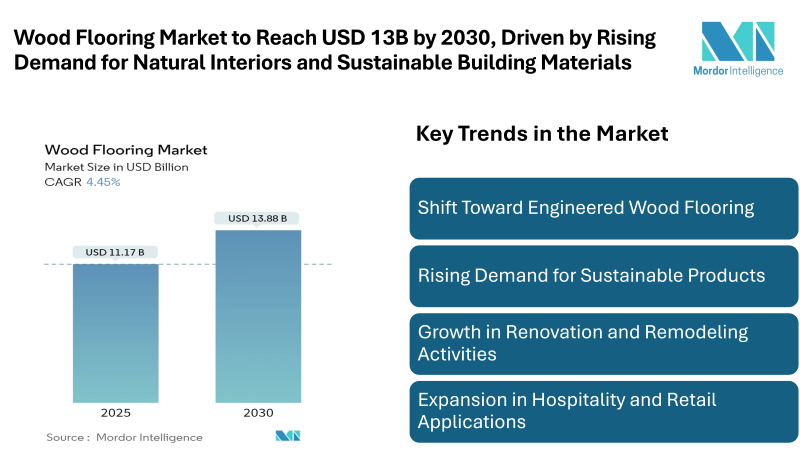According to Mordor Intelligence, the Wood Flooring Market size is estimated at USD 11.17 billion in 2025, and is expected to reach USD 13.88 billion by 2030, at a CAGR of 4.45%, supported by consistent demand from housing renovation, new construction activity, and interior design upgrades. The market is witnessing stable expansion as consumers increasingly prefer flooring materials that combine aesthetics with durability and environmental compatibility. The wood flooring market continues to gain steady attention across residential and commercial construction due to its natural appearance, durability, and long-term value.