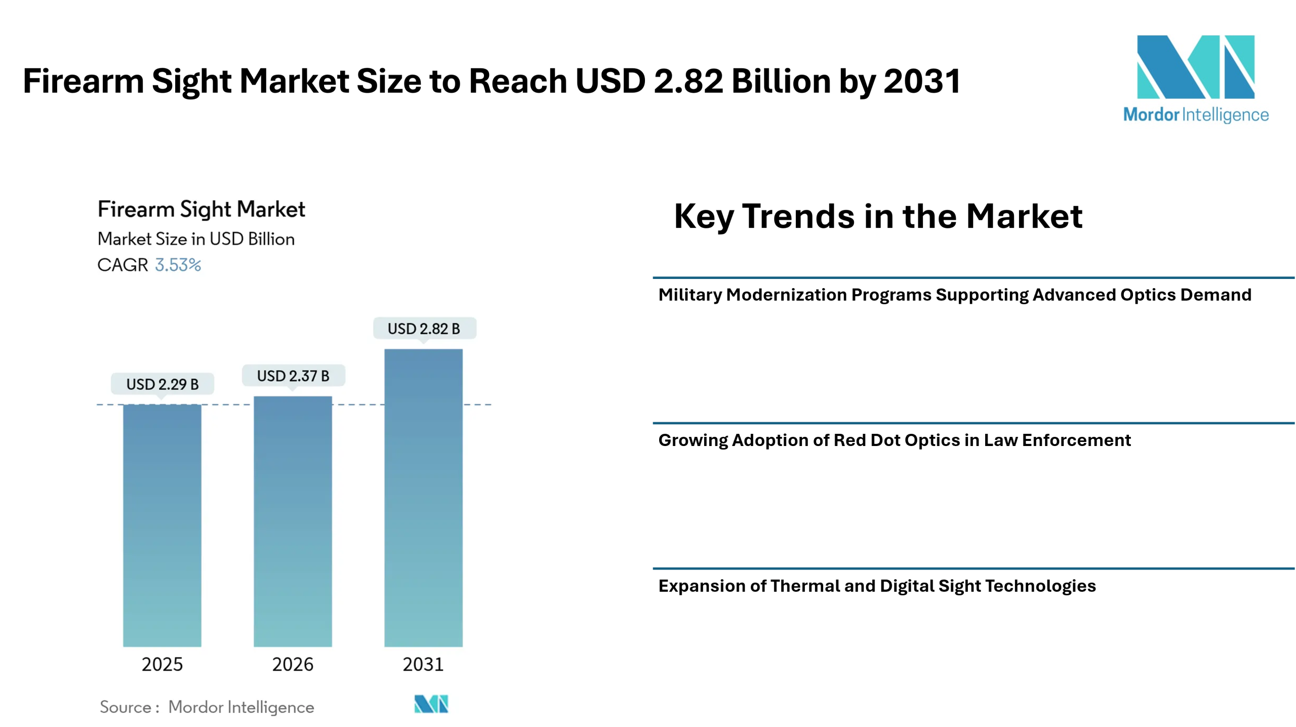 According to Mordor Intelligence, the global firearm sight market size is projected to reach USD 2.82 billion by 2031, growing from USD 2.37 billion in 2026 at a CAGR of 3.53% during the forecast period. The steady expansion of the firearm sight industry is linked to ongoing military modernization programs, increased adoption of optic-equipped service weapons, and the integration of digital and thermal technologies into conventional sighting systems.
