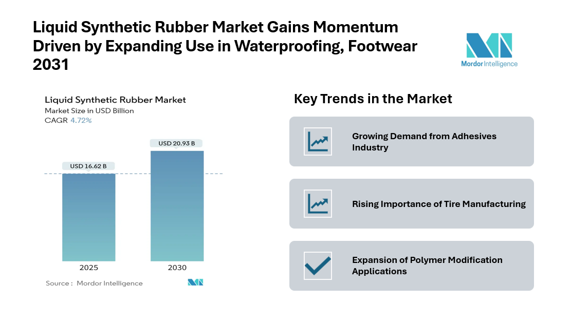 The Liquid Synthetic Rubber Market is gaining steady attention across multiple industrial sectors due to its flexibility, durability, and strong bonding properties. According to Mordor Intelligence, the market is valued at USD 16.62 billion in 2025 and is expected to reach USD 20.93 billion by 2030, growing at a CAGR of 4.72% during the forecast period. By 2026, the market continues to show consistent expansion supported by rising industrial demand and evolving applications.