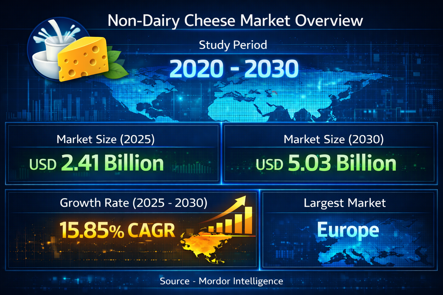 The non-dairy cheese market is entering a strong and sustained growth phase as consumers increasingly seek alternatives to traditional dairy-based products. According to Mordor Intelligence, the Non-Dairy Cheese Market size is valued at USD 2.41 billion in 2025 and is projected to reach USD 5.03 billion by 2030, reflecting robust expansion across retail and foodservice channels.