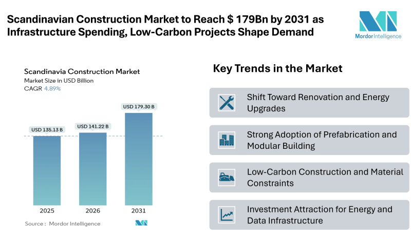 According to Mordor Intelligence, the Scandinavian construction market size was valued at USD 135.13 billion in 2025 and is estimated to grow from USD 141.22 billion in 2026 to reach USD 179.3 billion by 2031, registering a CAGR of 4.89% during the forecast period (2026–2031). The Scandinavian construction industry is entering a phase where public investment, energy transition projects, and renovation programs are driving activity more than speculative housing development. Governments across the region are prioritizing transportation links, defense-related facilities, renewable energy hubs, and modernization of aging infrastructure, creating stable long-term demand in the Scandinavian construction market.